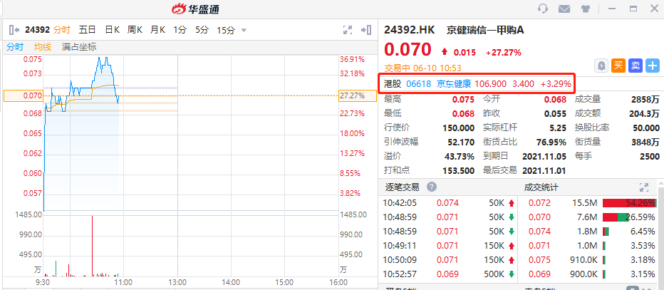 相关涡轮方面,京健瑞信一甲购A涨27.27%,其行使价为150港元,到期日为2021年11月5日,溢价43.73%。