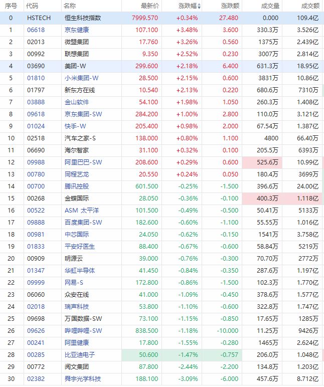 京东健康、微盟集团涨超3%;联想集团、美团-W、小米集团-W、新东方在线涨超2%。