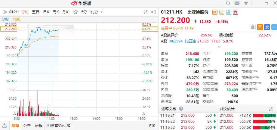 华盛资讯6月10日消息,比亚迪股份早盘拉升上涨,截至发稿,比亚迪股份涨6.46%,现报每股212.2港元,总市值6071亿港元,成交额16.45亿港元。