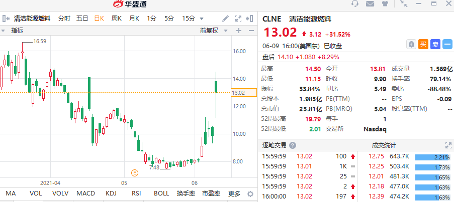 行情信息显示,周三,CLNE一度涨近45%,最终收涨超31%,报13.02美元,该股在盘后的交易中继续上涨超8%。