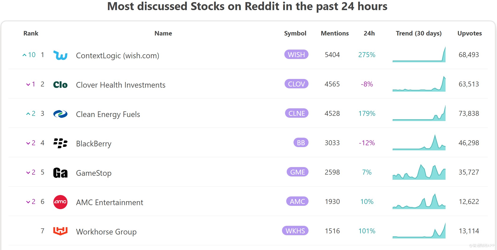 和以往熟悉的剧情一样,公司方面并没有公布任何消息,唯一特别的地方是,CLNE在Reddit上的讨论度节节攀升,在昨日讨论热度榜中一度上升至第二名,但随后热度下降至第三,排在ContextLogix(WISH)及Clover Health(CLOV)之后。