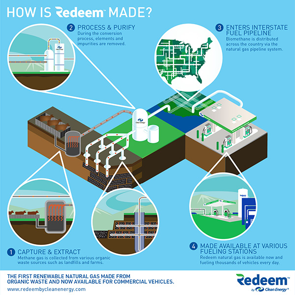 作为公司最热门的产品Redeem(一种由可再生天然气制成的生物燃料),公司从农场、奶牛场和垃圾堆填收集甲烷(一种有效的温室气体)并将其加工成可用燃料。甲烷燃烧时,会转化为二氧化碳,而二氧化碳是效力较低的温室气体。因此,使用Redeem实际上有助于减少温室气体排放。