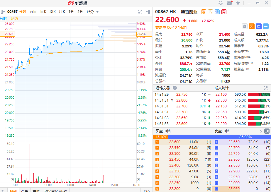 华盛资讯6月10日消息,康哲药业午后涨幅一度扩大至8%,现报22.6港元每股,涨7.62%,暂成交1.377亿港元,最新总市值558.4亿港元。