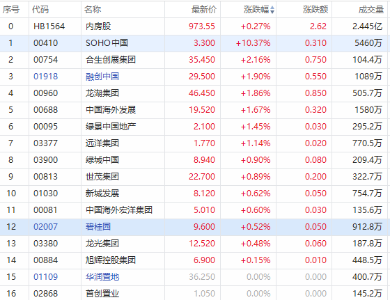 板块异动 | 港股内房股上扬 SOHO中国涨超10%领涨