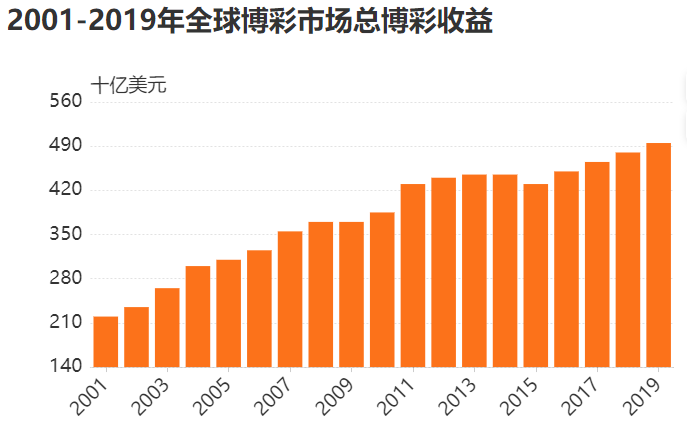 据艾媒咨询数据显示,2019年全球非完全统计的博彩收益已经高达4900亿美元。而亚洲的博彩收入占据了全球总收入的三分之一,是全球最大的博彩和体育博彩市场,其中足球又是博彩业五大支柱产业之一。欧美博彩收入紧随其后,其中美国内华达州是线上博彩公司的集聚地,2018年体育博彩公司数量就已经高达190家。数据显示,美国博彩行业每年为美国经济做出了约1375亿美元的贡献。