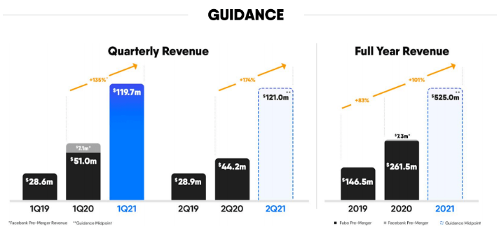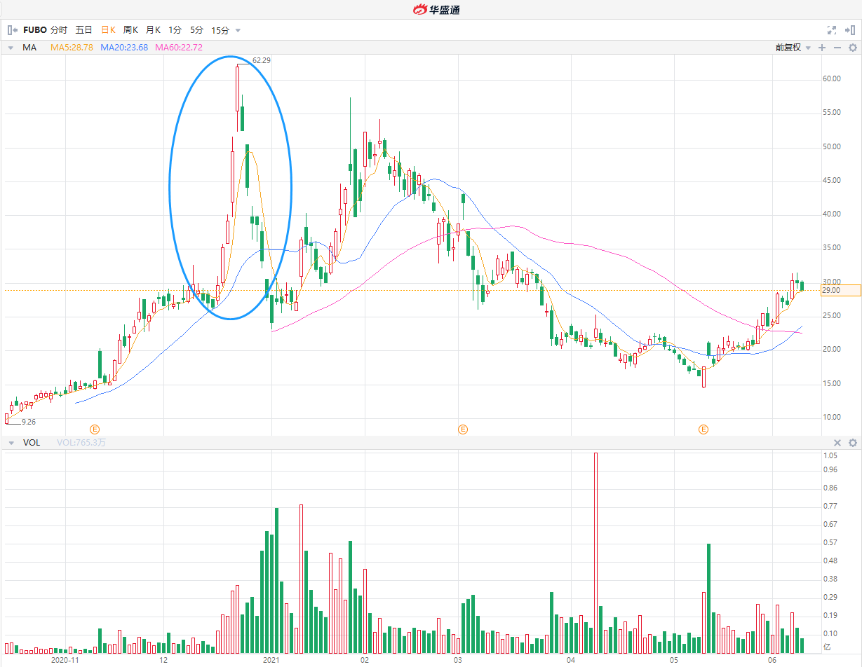 虽然当时有过于炒作的嫌疑,但可以看出市场对于fubo赛事转播+体育博彩运营模式的期待。在经历长达半年的回调之后,近期股价再度呈现了较为明显的上涨势头。这得益于公司强劲增长的业绩表现:2021年Q1,公司实现1.2亿美元营收,同比大增135%。其中广告业务收入1260万美元,同比增加206%,会员订阅营收也达到1.07亿美元,同比增131%,付费用户达到59万,同比翻倍。业绩表现远超市场预期,公司也提高了2021年的业绩指引,预计2021年营收将在5.2-5.3亿美元之间,付费用户进一步增长至83-85万。