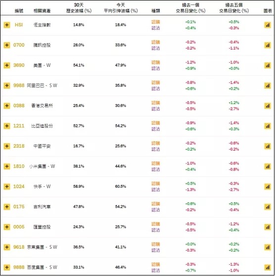 周四恒指相关权证的平均引伸波幅小幅下降,报约18.4%。个股方面,美团、小米相关认购证的引申波幅调降,快手相关认沽证的引申波幅调降。