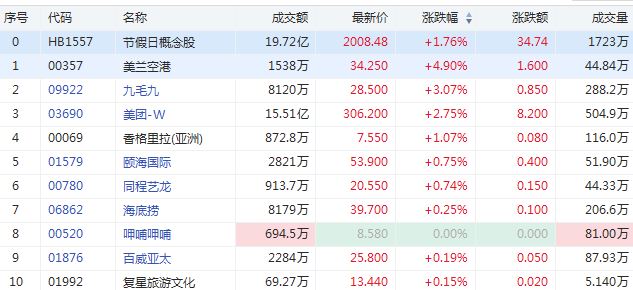 华盛资讯6月11日消息,节假日概念股今日普遍走高。截至发稿,美兰空港涨近5%,九毛九涨超3%,美团涨超2%,颐海国际涨0.75%,同程艺龙涨0.74%。