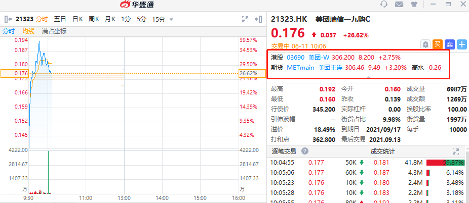 相关涡轮方面,美团瑞信一九购C涨26.62%,其行使价为345.2港元,到期日为2021年9月17日,溢价18.49%。