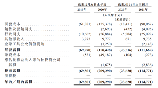 公司于往绩记录期间的各个期间均产生经营亏损,截至2019年及2020年度以及截至2021前三个月,分别录得亏损净6980万元、2.093亿元及1.148亿元。
