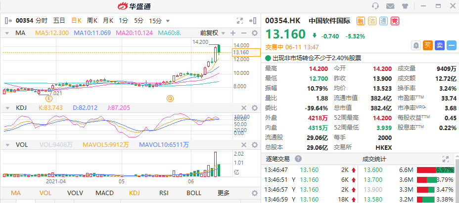 华为6月2日正式发布鸿蒙系统,中软国际作为华为第一大软件合作伙伴,近日股价持续大涨不断创出历史新高,此前5个交易日累涨45%,今日上午盘中曾涨至14.2港元,再创历史新高。