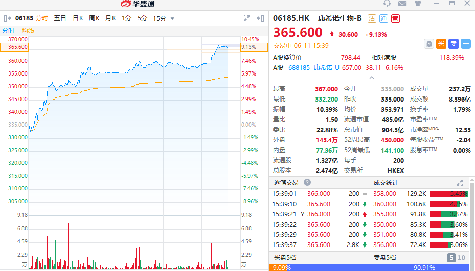 华盛资讯6月11日消息,港股康希诺生物尾盘涨幅扩大逾9%,向上突破多条均线,目前报365.6港元每股,总市值904.5亿港元,股价较年初翻倍。