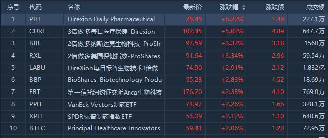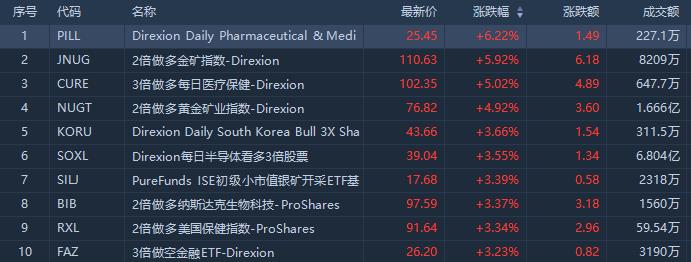 涨幅居前的有3倍做多每日医疗保健的CURE涨5.03%,成交额647.7万美元;2倍做多纳斯达克生物科技的BIB涨3.37%,成交额1560万美元。