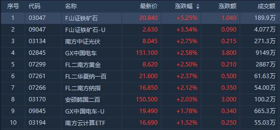 今日涨幅位居前的ETF有F山证铁矿石涨5.25%,成交额189.9万港元;光伏方面,南方中证光伏涨2.75%,三日累计涨超8%,成交额271.3万港元。