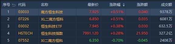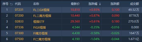 看多恒指相关ETF走强,南方两倍做多恒科(07226.HK)涨0.51%,成交额6081万港元;