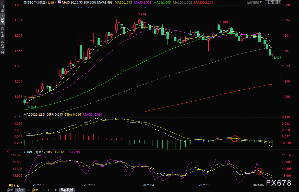 周五(6月11日)美国10年期国债收益率一度跌至1.426%,这是10年期美债收益率自3月初以来的最低位,
