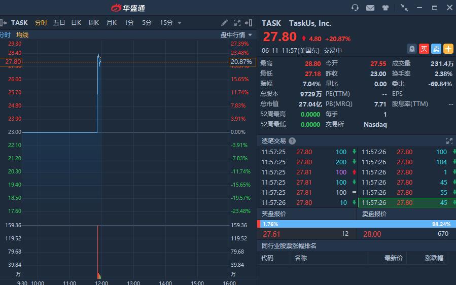 华盛资讯6月11日消息,科技企业流程外包公司TaskUs今日挂牌纳斯达克,首日上市开涨23.1%,报28.5美元。截至发稿,该股上涨20.87%,股价报27.80美元。