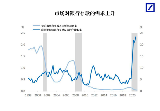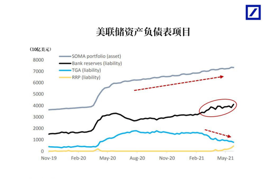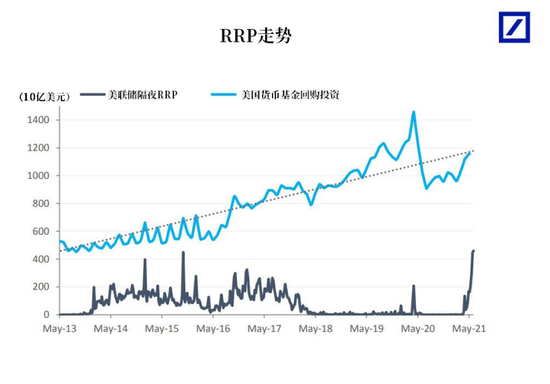 与此同时,市场对存款的需求激增,这迫使银行持有低收益率资产,给银行的补充杠杆率(SLR)带来了下行压力,因此,现在银行机构要么筹集资金,要么减少贷款。在这种情况下,美联储逆回购操作能让存款通过流入货币市场的方式离开银行资产负债表,然后存入逆回购工具。