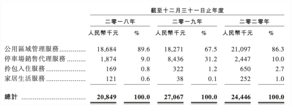 这11%里,关于康养部分的收入似乎又看不见。如下图,招股书只说明了公用区域管理服务、停车场销售代理服务、拎包入住服务、家居生活服务四项。
