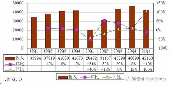 滴滴2018年、2019年、2020年营收分别为1353亿元、1547.86亿元、1417.36亿元;滴滴2021年第一季度营收为421.63亿元(约64.35亿美元),上年同期为204.72亿元。
