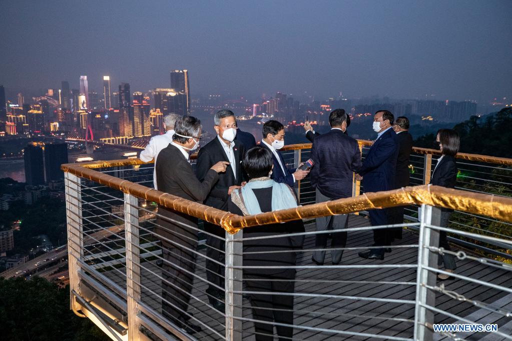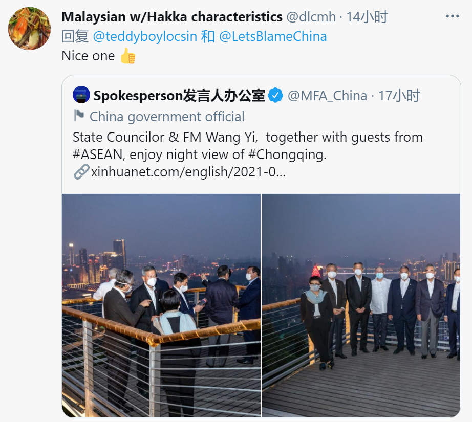 还有网友转发中国外交部发言人办公室发布的王毅与各国来宾享受重庆夜景的推特,并称赞道“不错”。↓