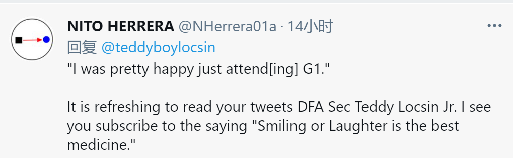 “‘我很高兴能参加G1。’读你的推文让人耳目一新,菲律宾外长洛钦。我看你赞同‘微笑或大笑是最好的良药’这句话。”