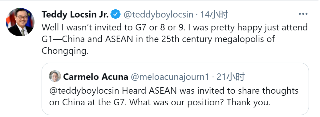 有网友当地时间11日@洛钦提问:“听说东盟受邀在G7峰会上分享对中国的看法。我们(菲律宾)的立场是什么?谢谢你!”