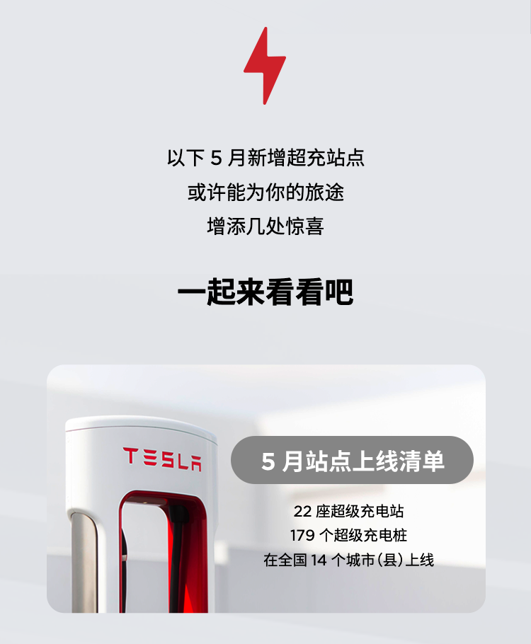 原标题:5月新增超充站点|端午假期,满电出行 来源:特斯拉
