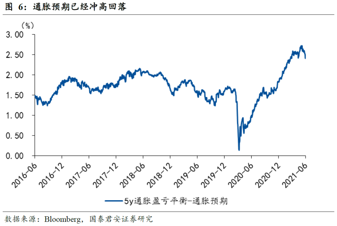 市场通胀预期在 5 月中旬冲高后当前已经有所回落,根据 5 年期的通胀盈亏平衡利率观察,当前的通胀预期已经从 5 月中旬高点的 2.72%下降到了 2.47%。另外,就美联储而言,在平均通胀目标制下,会加大对通胀的容忍度且其对通胀的前景还偏向认为是基数效应和短期供应紧张等导致的“暂时性”的高通胀,美联储在3 月议息会议中对 2021-2023 年核心 PCE 的预期为 2.2%、2%和 2.1%,在 6 月议息会议上或有所上调,但是根据新的政策框架或不改其在 2022 年底加息的预期。