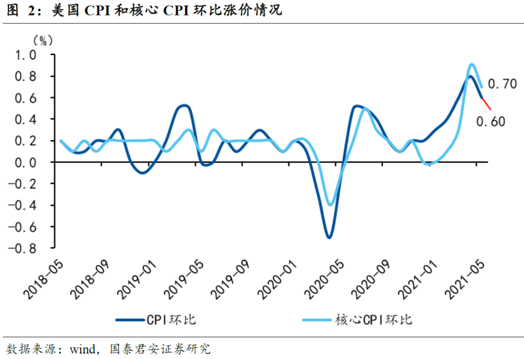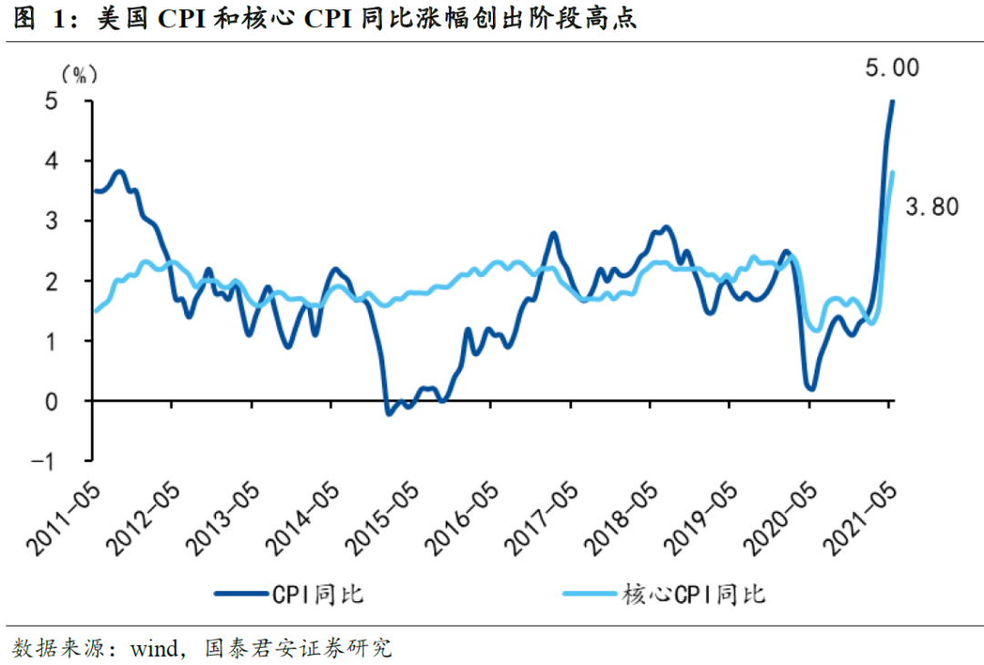 事件:5月,美国通胀环比上涨0.6%,前值0.8%,同比增长5%,创出了2008年以来的新高。核心CPI环比上涨0.7%,前值0.9%,同比上涨3.8%,创1992年以来新高。