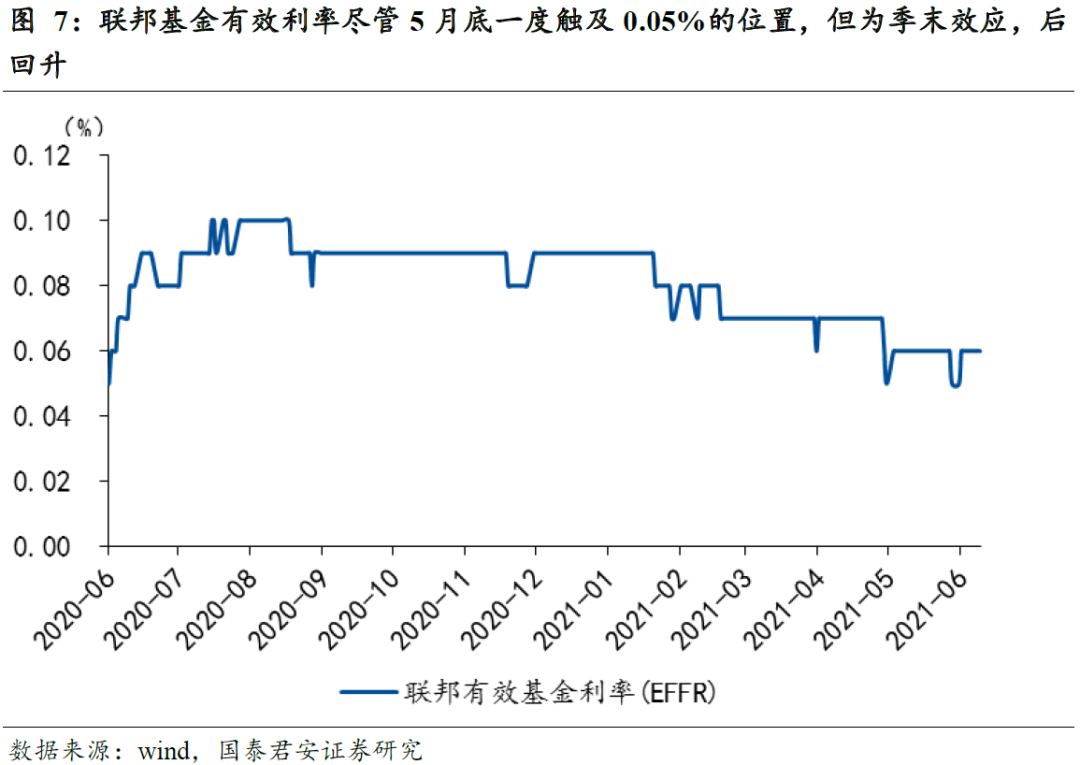 通胀持续高位运行情况下,美联储或继续安抚市场,但需要关注 3 季度后期 QE Tapering 信号。6 月 16 日,美联储将召开 6 月议息会议,我们认为美联储将继续安抚市场对高通胀的担忧,或增加对 QE Tapering 的相关讨论,但是我们认为不会释放明确的信号。考虑当前就业数据还没有达到鲍威尔所提及的连续几个月较好就业的情况(当时鲍威尔指向 2020 年 3 月,当时新增就业 78.5 万),美联储预期仍会观察。此外,当前逆回购使用量急剧增加的问题一定程度在美联储的预料之中,在 3 月 17 日,在美联储公布利率决议后,纽约联储根据联邦公开市场委员会指示调整了隔夜逆回购协议操作,将从 2021 年 3 月 18 日起,将单一对手方逆回购规模(RRP)上限从 300 亿美元提升至 800 亿美元,有意增大了隔夜逆回购流动性吸纳量。此外,联邦基金有效利率尽管 5 月底一度触及 0.05%的位置,但或为月末效应所致,为符合监管标准而增加了流动性储备,此后又回升到了此前的 0.06%的水平。隔夜逆回购整体运行或未超联储的预期,功能发挥正常,目前还不至于引发政策调整。