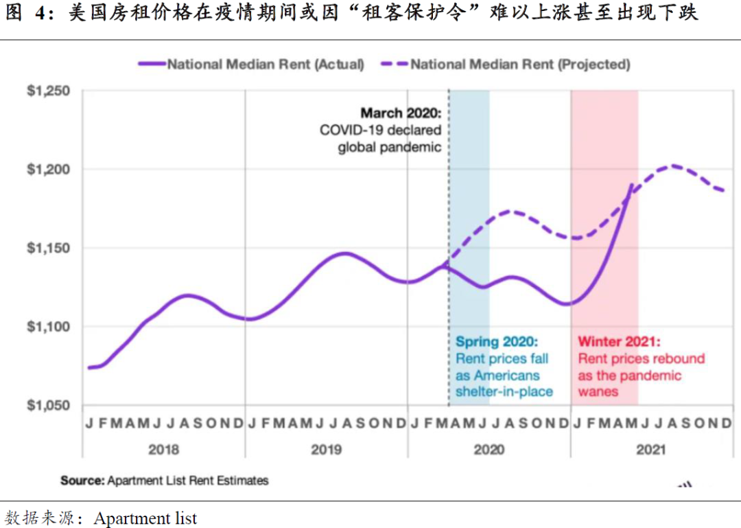3)居住服务涨价相对温和,或与“租客保护令”相关。居住服务(占 GDP 权重32.9%)整体环比上涨 0.3%,其中租赁住房服务上涨 0.2%,自有住房的等值租金上涨 0.3%,整体涨价相对温和。而家具及其服务的价格(The household furnishingsand operations index)环比上涨 1.3%,创 1976 年以来的最大涨幅。在房地产价格大涨的情况下,美国的居住服务的价格持续保持相对稳定,或与当前美国实行的疫情期间“租客保护令”政策有关。在疫情期间,美国政府公布了“租客保护令”(Emergency Housing Protections and Relief Act of 2020),该法令旨在帮助因为疫情而失去工作收入无法保障,难以支付租金的房客,给予其租金延期支付豁免期,期间房东不可以驱逐租客。这项措施在 2020 年 6 月到期后多州又将该项措施延长到 2021 年 6 月底,如 1 月 29 日,加州通过立法,延长了《租客、房主和小房东救济法》。延长了对遭遇 COVID-19 经济困难的租客的驱逐保护,立即生效。根据该方案住宅租户在 2020 年 3 月 1 日至 2021 年 6 月 30 日期间未支付到期的租金,可获得驱逐保护。“租客保护令”措施的存在导致房租价格难以提升。但是随着部分州政策的取消,近期租金的价格出现上涨势头。根据租赁服务机构Apartment list 数据,美国租金中位数在疫情期间出现下滑后,5 月全国租金指数环比上涨 2.3%,创 2017 年 1 月以来的最大单月涨幅。因此,后续随着租客保护措施的到期,住房成本或提高,加大通胀风险。