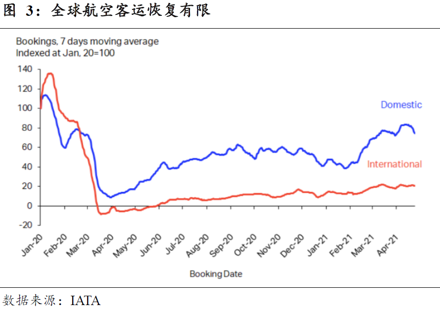 2)疫情整体缓解,医疗服务需求减弱,外出活动的增多,带来了机票需求以及服装需求。但当前票价较高并非供求矛盾所决定,主要受到航空公司低客座率和高运营成本的影响,根据国际航空运输协会的数据,美国的航空市场尽管恢复最快,但是4月的客座率仍然低于2019年同期约18个百分点,为66.8%。在偏低的客座率下,航空公司为提高收入,则票价相对有所提高,也体现了对当前强出行意愿人群的“价格歧视”。
