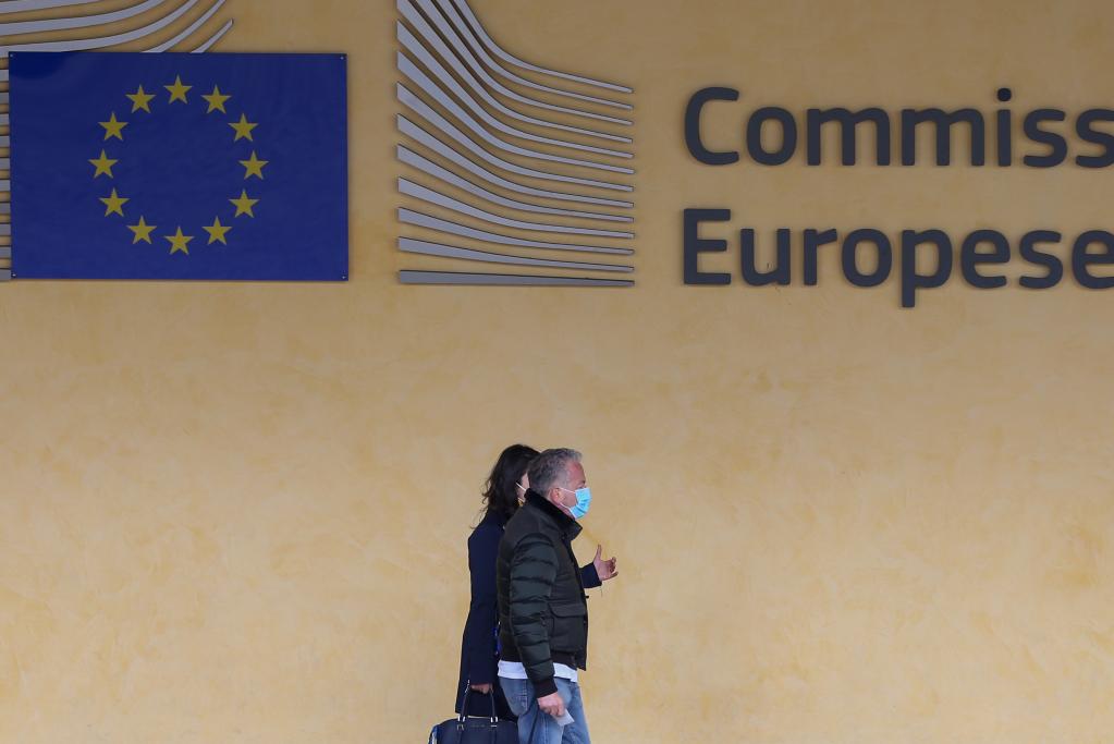 5月4日,人们在比利时布鲁塞尔的欧盟委员会总部外行走。新华社记者 郑焕松 摄