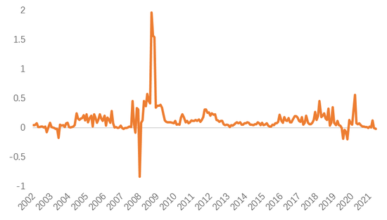 过去一个月有25个州宣布疫情时期每周300美元的失业津贴(PUA)将自6月起不再发放。7-8月,伴随失业补贴退出、学生复课,劳动参与率将逐渐改善,就业市场将显著恢复。假设非农就业未来每个月平均新增60万人,美国前期受疫情冲击而萎缩的就业规模,将在9月恢复至75%左右,并于2022年下半年前后5月完全修复。参照2013年的经验,美联储释放缩减QE信号的时间最快可能是在8月的Jackson Hole会议或9月的议息会议。