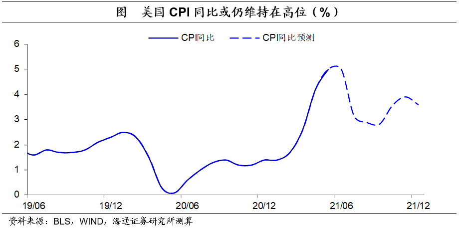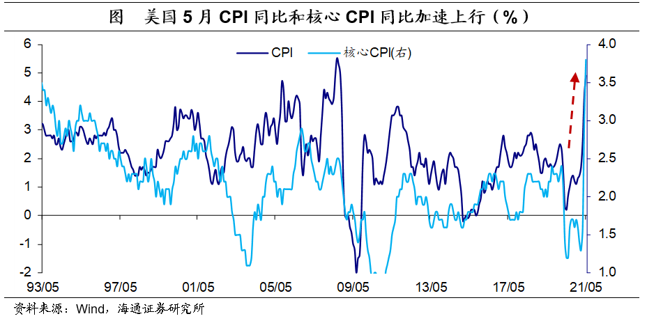 美国通胀超预期。5月美国CPI同比上升至5.0%,超市场预期(WIND口径)的4.7%,创2008年8月以来新高;此外,CPI环比0.8%,较上月持平,仍为13年2月以来新高。剔除食品和能源影响后,5月美国核心CPI同比上升至3.8%,超市场预期的3.4%,创1992年3月以来新高。