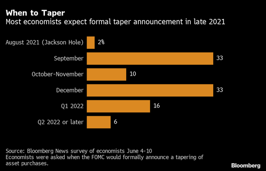 受访者认为美联储并不急于缩减货币刺激措施。约40%的经济学家预计,美联储会到8月末才开始朝着缩减每月1200亿美元购债规模迈出第一步。