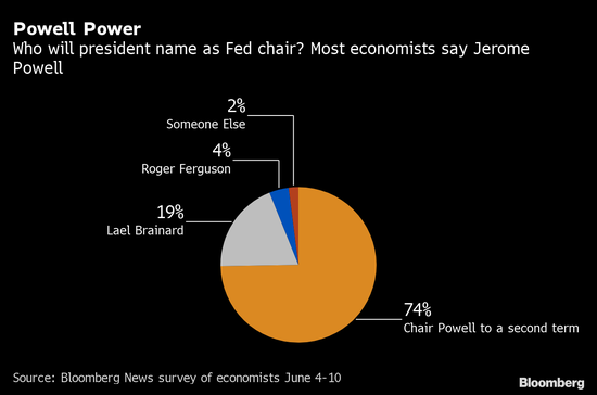 鲍威尔的主席任期将于明年2月届满。大约四分之三经济学家预计拜登会让他留任,这个压倒性的数字与4月调查时大致相同。