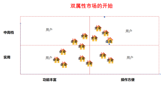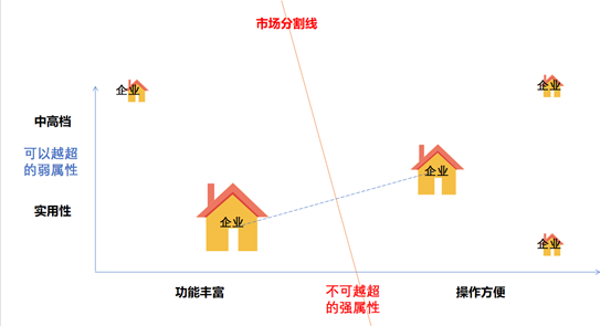 相反,如果“功能丰富程度”是强属性,“档次”是弱属性,那么“双寡头”的市场就是按“功能丰富程度”这个属性进行市场分割。
