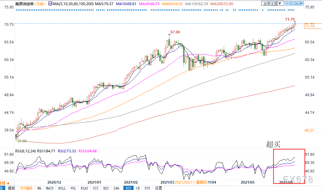 投机者持有的美国原油期货多头头寸为大约三年来最高。然而,技术指标显示油价处于超买区域,可能会回调。