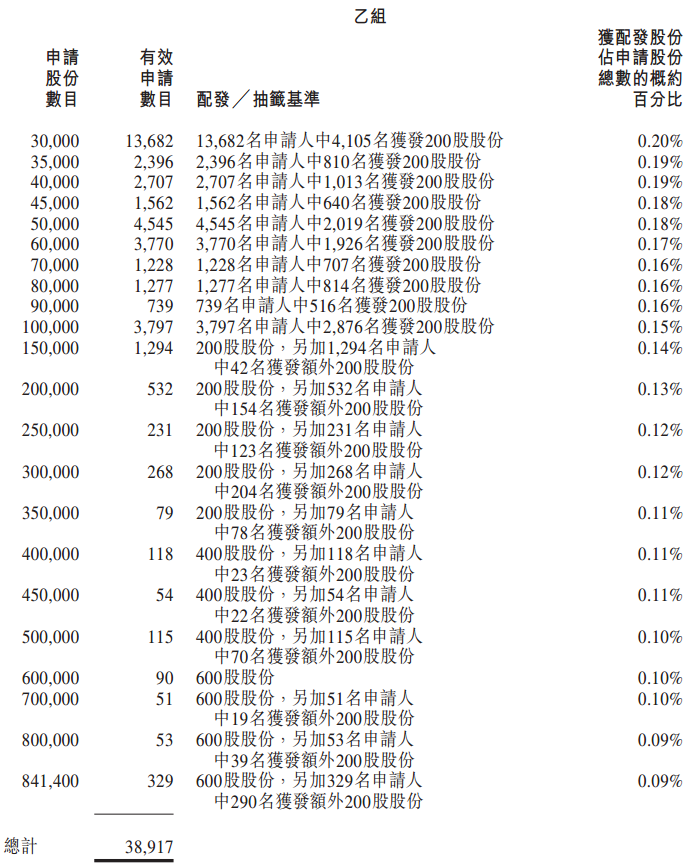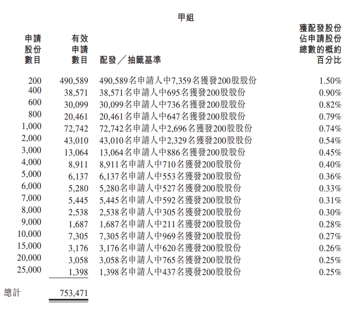 公开发售一手中签率1.5%,乙头中签率30%,申购750手才稳获一手。