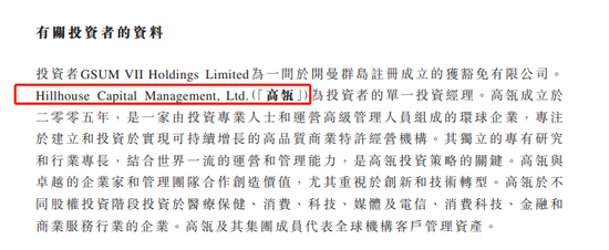 投资者GSUM VII Holdings Limited为一间于开曼群岛注册成立的获豁免有限公司。Hillhouse Capital Management,Ltd.(高瓴)为投资者的单一投资经理。