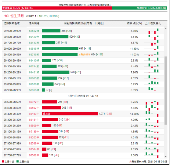 街货分布方面,至上周五,恒指牛证街货贴价区间主要在收回价28200点至28700点之间,累计相当约2220张期指合约;恒指熊证街货在收回价28900点至29400点之间,累计相当约1384张期指合约。