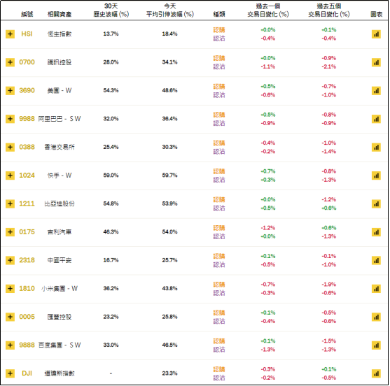 上周五恒指相关权证的平均引伸波幅报约18.4%。个股方面,吉利汽车相关认购证的引申波幅调降约1.2%,腾讯、百度相关认沽证的引申波幅调降超1%。