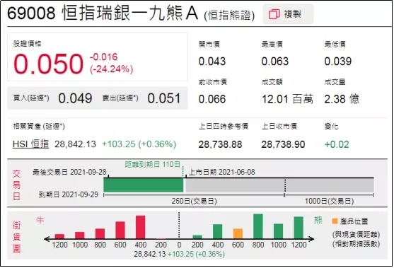 2、看错方向:恒指瑞银一九熊(69008.HK),上周五下跌24.24%。