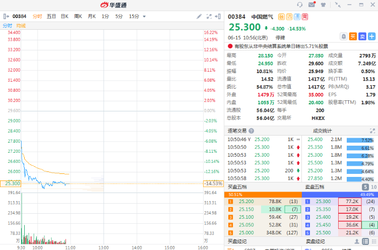 中国燃气暂时停牌,停牌前急挫14.53%,报25.3港元,股价见逾7个月低位。