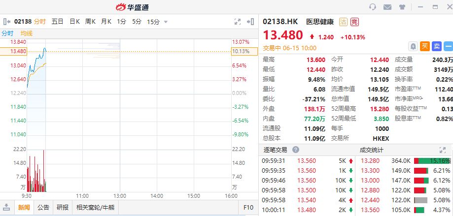华盛资讯6月15日消息,香港医思集团发布公告,就2021年4月1日至2021年4月30日期间,集团预期取得月内销售额不少于2.3亿港元,较去年同期升幅不少于75%。受消息刺激,截止发稿,医思健康上涨10.13%,结束此前四连阴走势,现报每股13.48港元,总市值149.5亿港元,成交额3149万港元。
