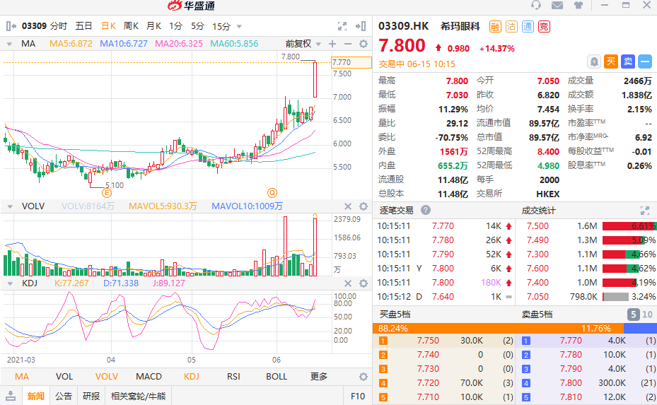 华盛资讯6月15日消息,希玛眼科今日强势高开,盘中持续走强现涨14.37%,报7.8港元每股,最新总市值达89.57亿港元,换手率2.15%。