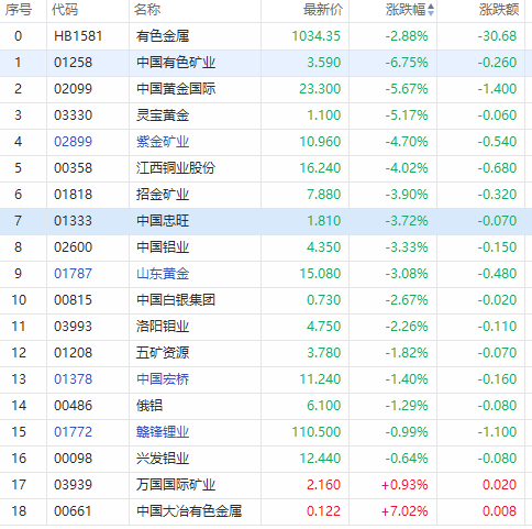 华盛资讯3月11日消息,港股有色金属板块下挫。截至发稿,中国有色矿业跌超6%;中国黄金国际、灵宝黄金跌超5%;紫金矿业、江西铜业股份跌超4%;招金矿业、中国铝业等跌超3%。