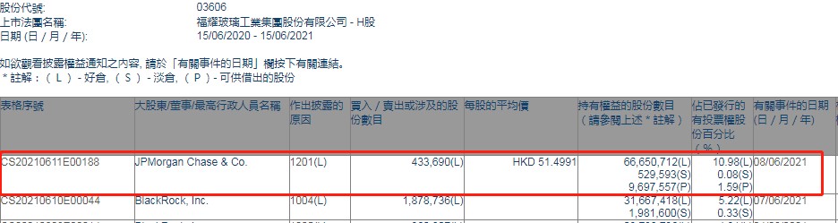 香港联交所最新资料显示,6月8日,摩根大通减持福耀玻璃(03606)43.369万股,每股作价51.4991港元,总金额约为2233.46万港元。减持后最新持股数目约为6665.07万股,最新持股比例为10.98%。
